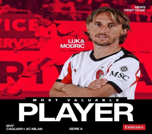 在今天凌晨进行的意甲第18轮比赛中,米兰客场1-0击败卡利亚里,赛后,莫德里奇被米兰官方评为本场比赛队内最佳球员。