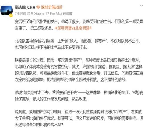 对此,媒体人郑志鹏发表了不同意见,郑老师认为:能感受到许利民的生气,但我的第一感受是言重了, 第二感受是北京队客场输给深圳,上升到“输人、输形象、输尊严”,不仅对队员不公平,也可能对球队接下来的士气造成不必要的打击。联赛是漫长的过程,因为一场球否定“尊严”,某种程度上是把结果看得太过绝对,也忽略了体育本身应有的容错空间。