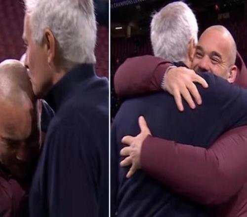 欧冠赛前穆里尼奥与两名昔日弟子重逢,并亲吻了斯内德的光头 -